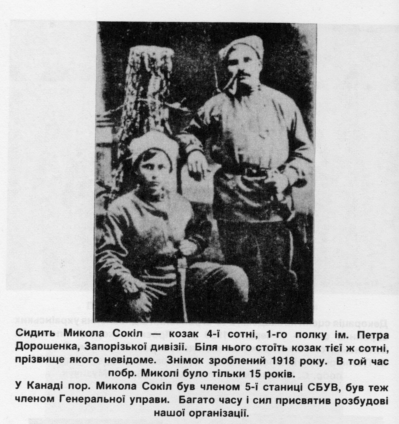 На світлині 1918 року бачимо Миколу Сокола – малого козака 4-ї сотні 1-го полку ім. Петра Дорошенка Запорозької дивізії. Миколі 15 років. Біля нього – козак цієї сотні, очевидно, опікун, “дядько”. До полку хлопець вступив 21 квітня 1918 року. Це був час, коли запорожці звільняли Донбас від московських більшовицьких окупантів.